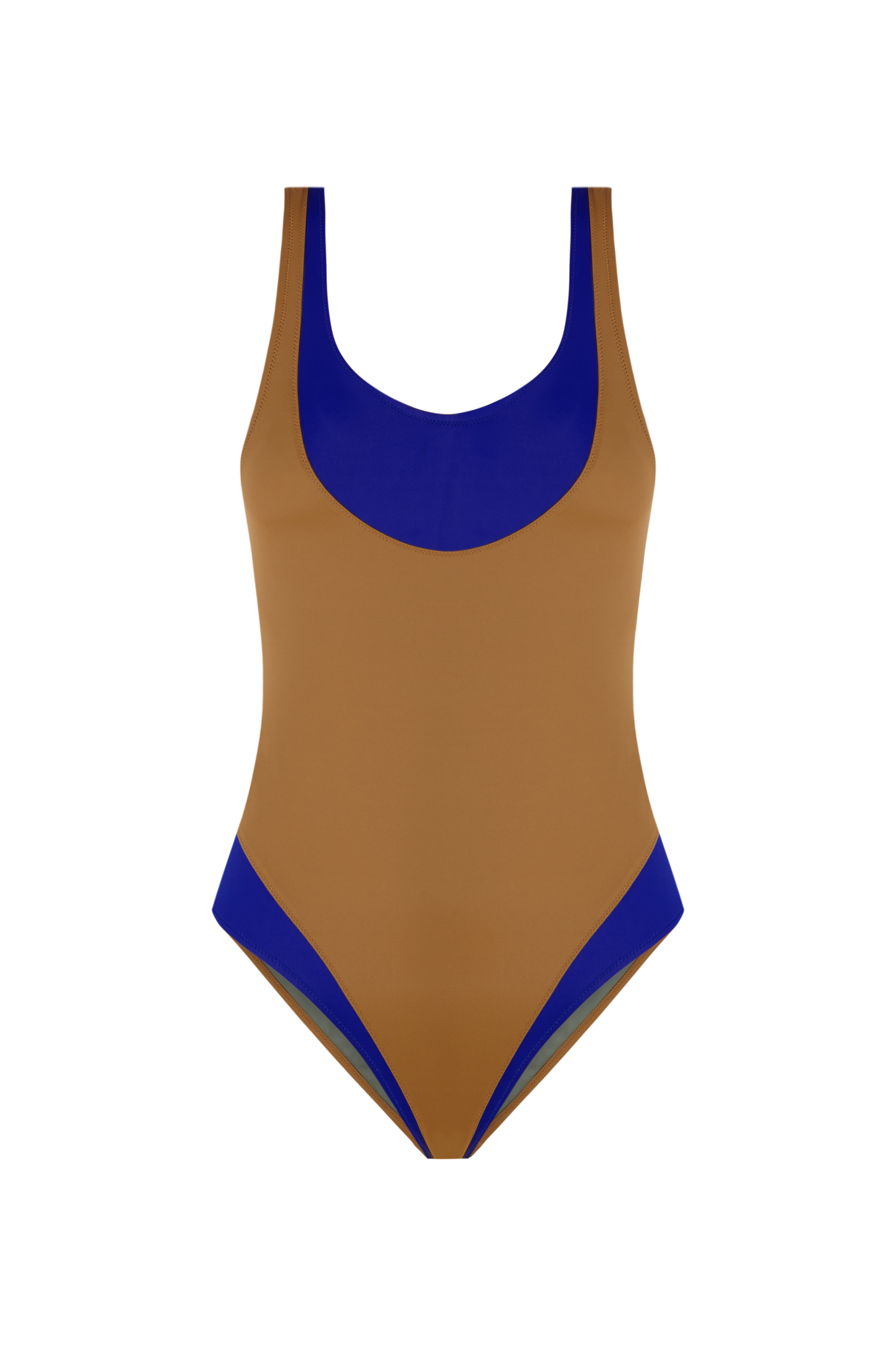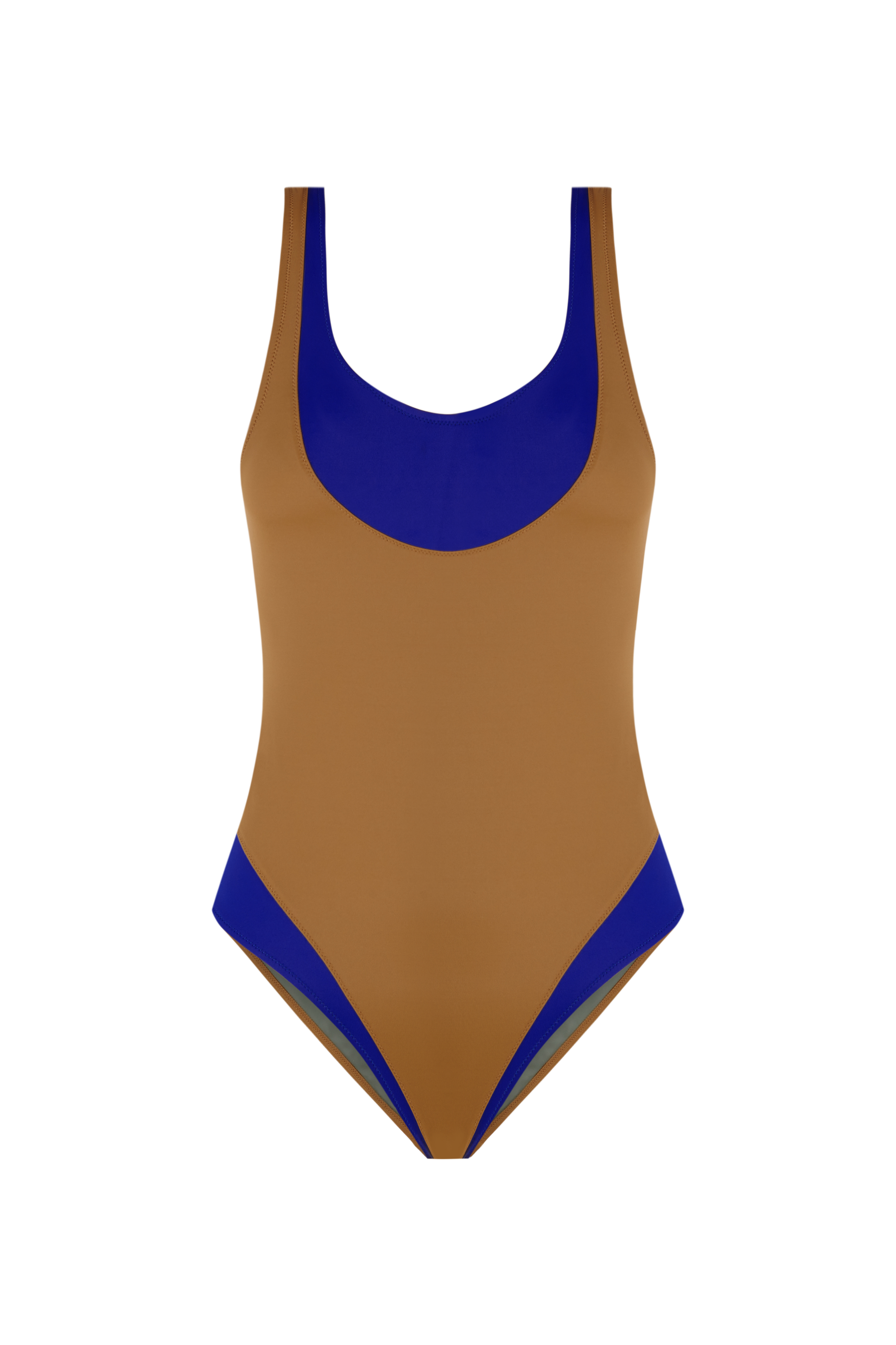 Sporty style one-piece featuring a contrast panels in front that creates the illusion of layering.