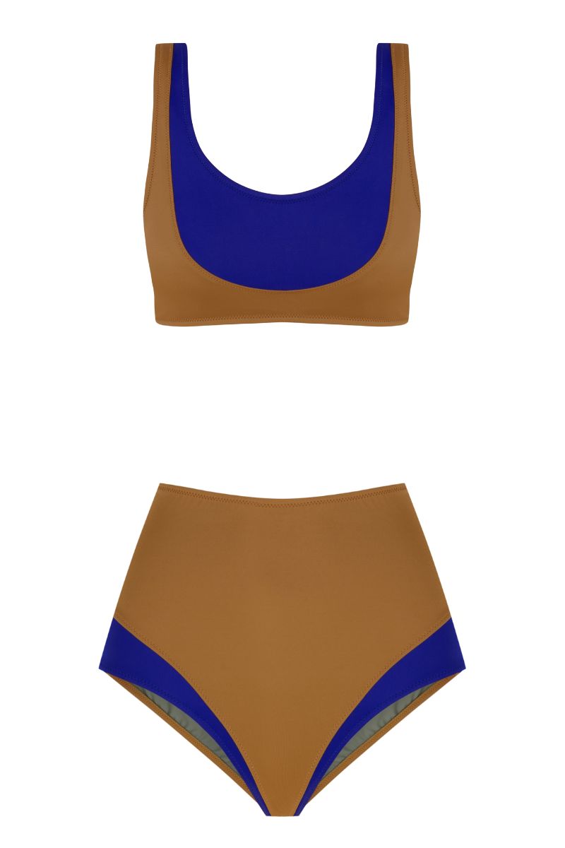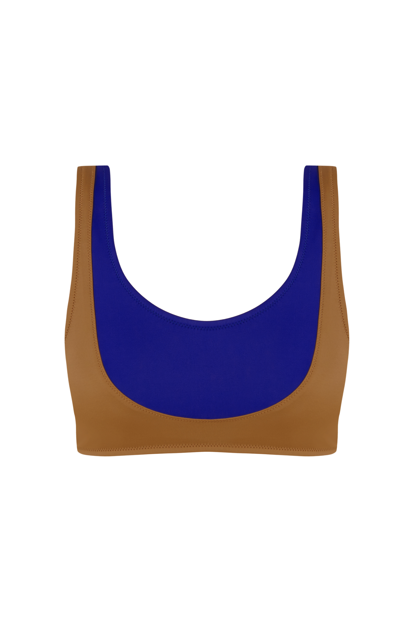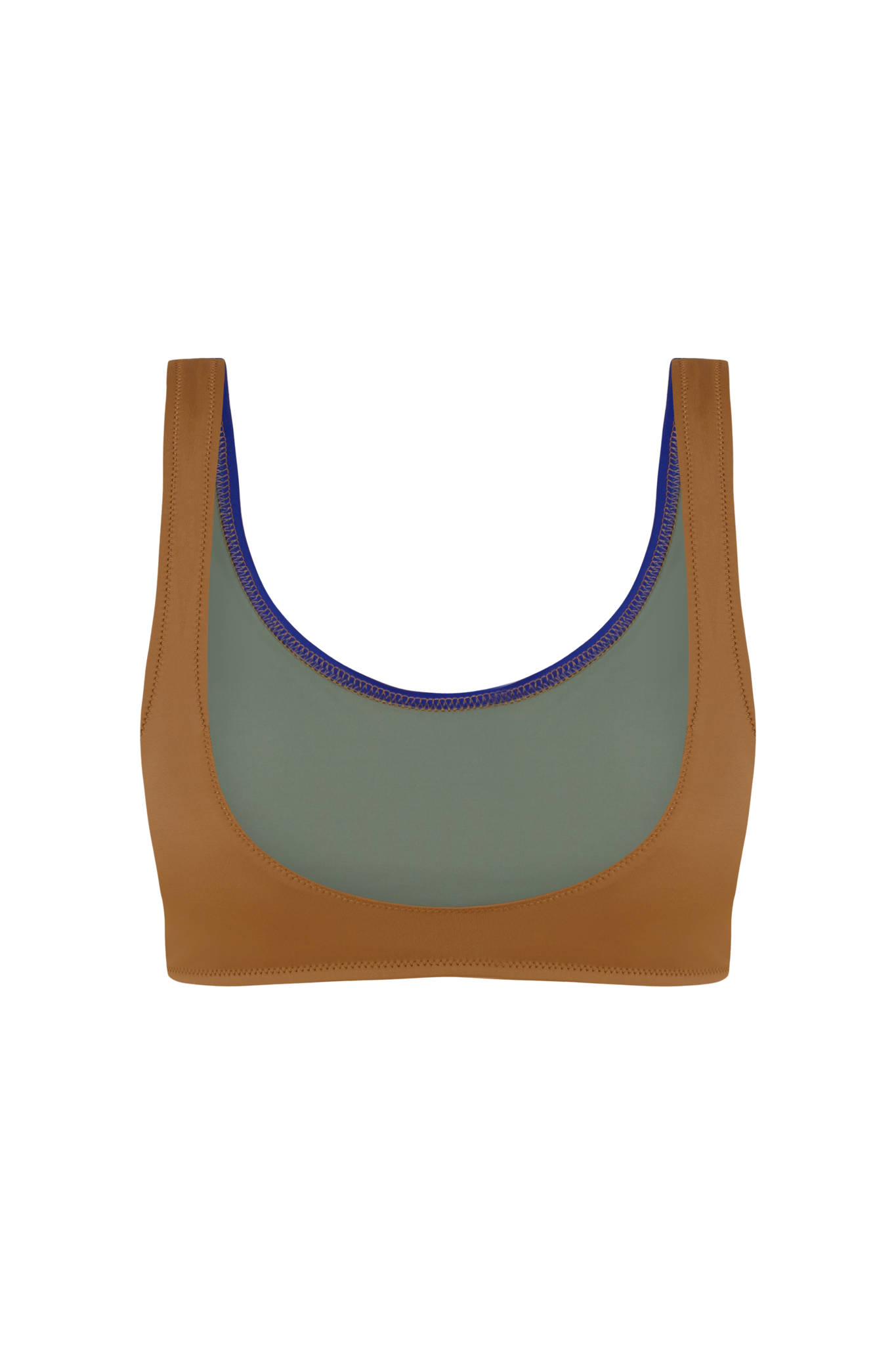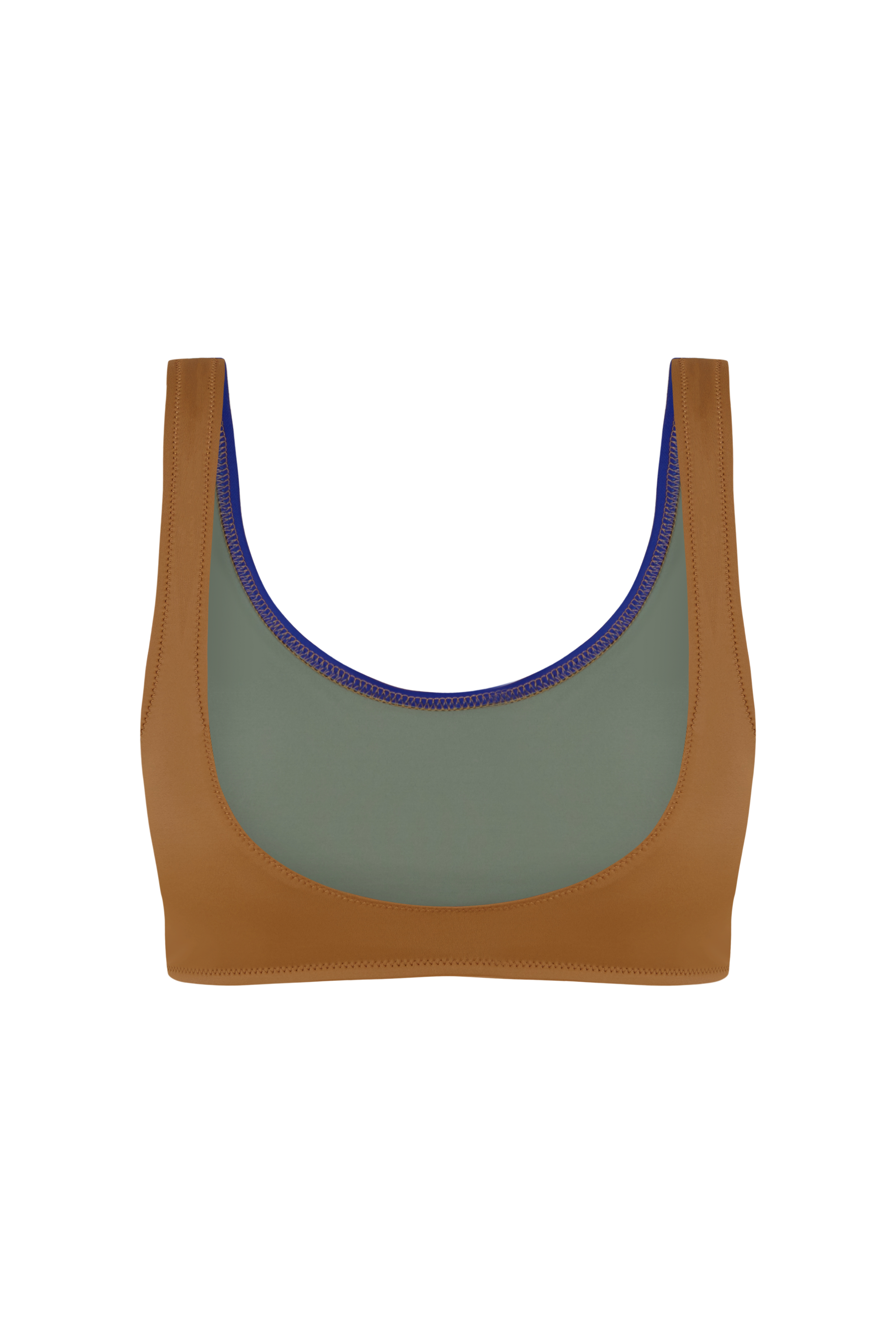 Sporty pull-on style bikini top featuring a contrast in front that create the illusion of layering. Non-padded and no cups.
