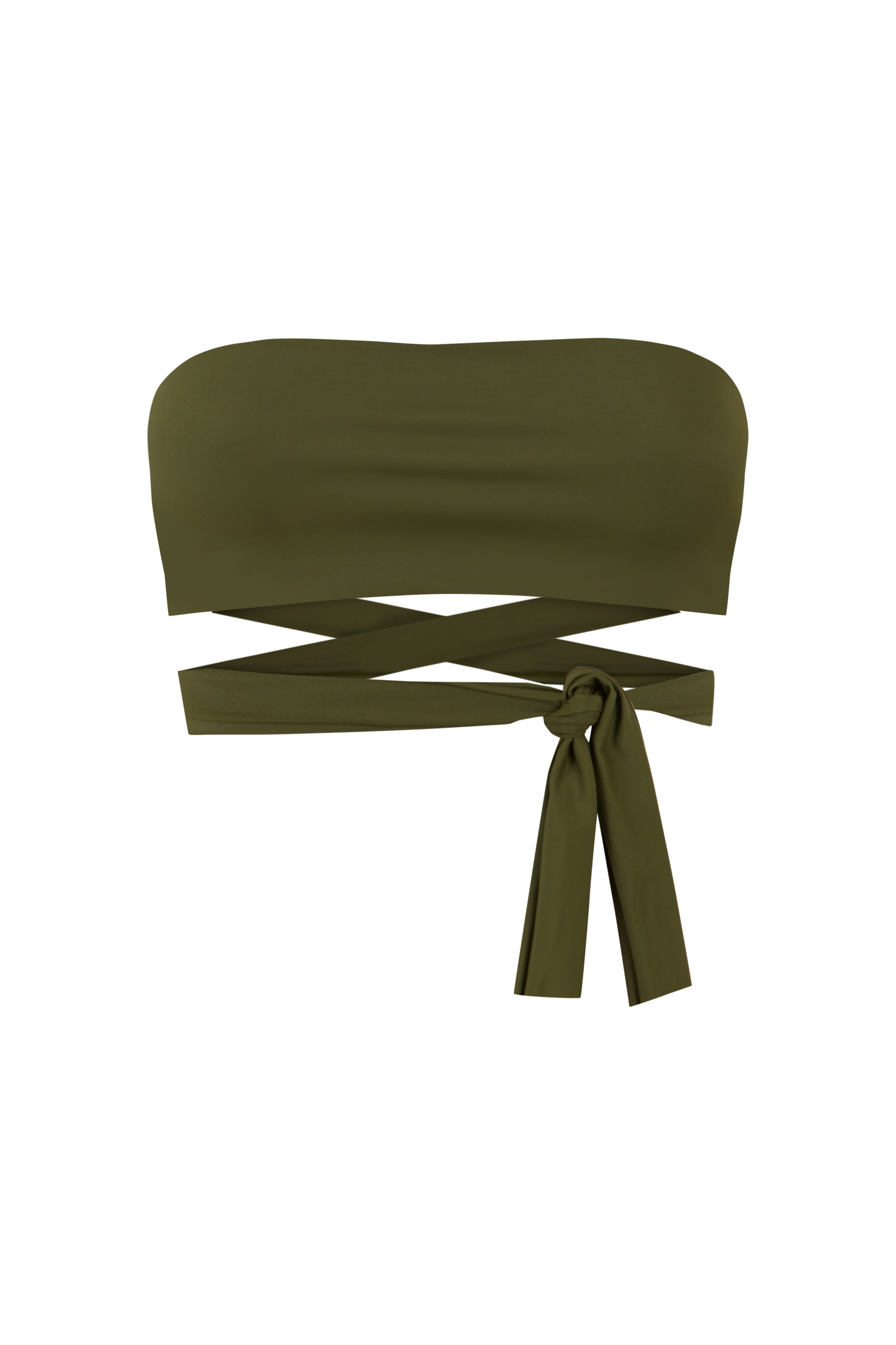 A modern evolution of the classic bandeau. The adjustable front tie allows for a customizable fit, while the crossed back adds a unique design element. Made entirely in Dark Olive Green, this versatile top comes in two sizes (small and large), making it almost one-size. Side boning ensures added support without compromising comfort. A basic with a twist, perfect for those seeking both style and practicality.